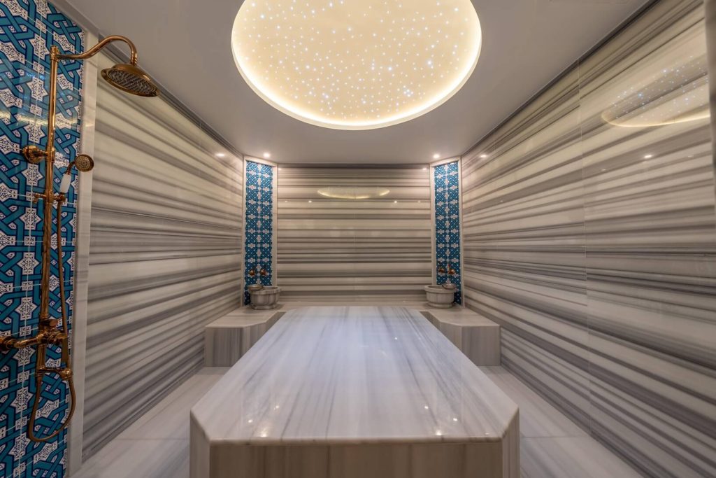 Spa kısmımızın içerisinde ayrı bir noktada yer alan Vip Hamam alanımız özel dinlenme odası, masaj alanı, jakuzi ve hamamdan oluşan tamamen kişiye özel kullanıma sunulan çok özel ve nezih bir alandır.